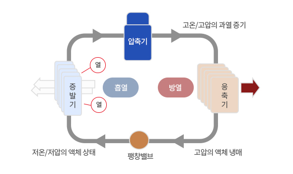 저온에 존재하는 열원을 고온으로 이동시켜서 거주 및 작업공간의 난방/급탕 에너지로 활용이 가능하게 하는 열원 이동 장치입니다.