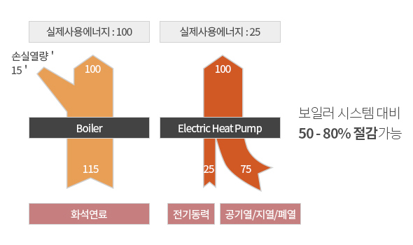 한 대의 유니트로 저온의 열원(대기)에서 열을 흡수하여 고온의 열매체(실내공기)에 반송하는 기계장치로서 구동에 필요한 동력 에너지보다 더 많은 에너지를 열 에너지의 형태로 공급하는 에너지 절약적인 열공급장치입니다.